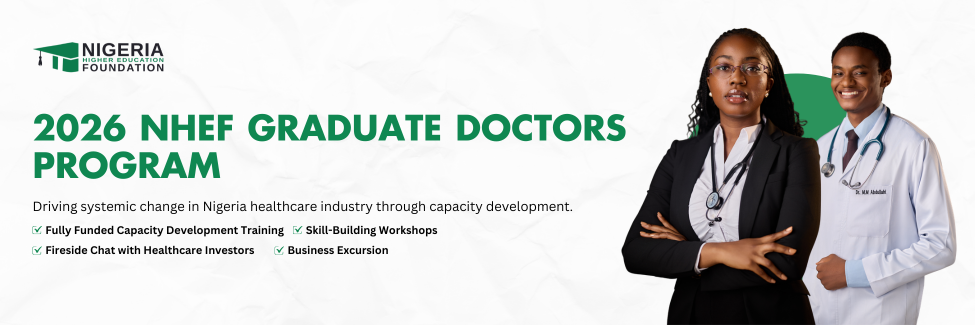 The Nigeria Higher Education Foundation (NHEF) Graduate Doctors Program is a leadership and capacity development initiative designed for post-housemanship doctors who have just completed the National Youth Service Corps (NYSC) and are now transitioning into full professional practice. Through a curated and immersive learning experience, participants gain the knowledge, perspective, and networks needed to navigate Nigeria’s evolving healthcare landscape and position themselves for meaningful, long-term impact. The program seeks to cultivate a new generation of medical professionals equipped with the competence, resilience, leadership capacity, and commitment to advance healthcare in Nigeria.