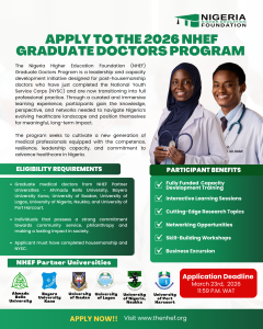 The Nigeria Higher Education Foundation (NHEF) is pleased to announce the official launch of applications for the 2026 NHEF Graduate Doctors Program, a flagship leadership and capacity development initiative designed for post-housemanship doctors transitioning into full professional practice after completing the National Youth Service Corps (NYSC).